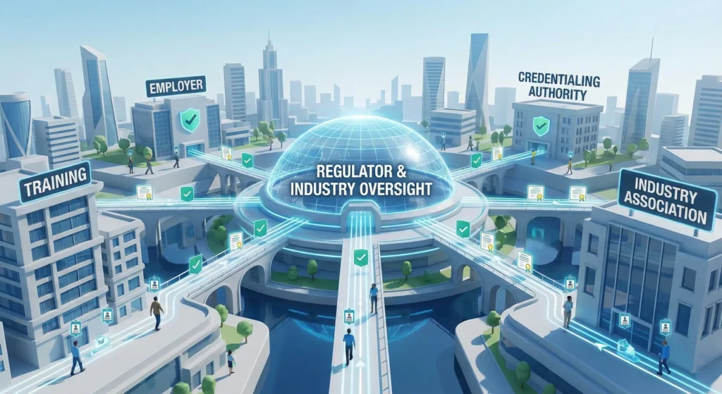 This is where regulators, industry associations, and oversight bodies must lead. Regardless of what advanced, industry-integrated training delivery and credentialing solution the industry oversight agency deploys, one core fact applies…Only regulators and sector-level organizations are positioned to effectively convene employers, training providers, and credentialing authorities around shared standards, common frameworks, and trusted digital infrastructure. By driving the shift toward integrated online training and digital credentialing, they can enable a complete, industry-wide training ecosystem.